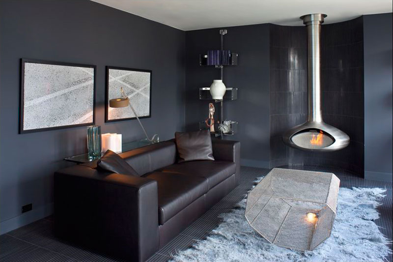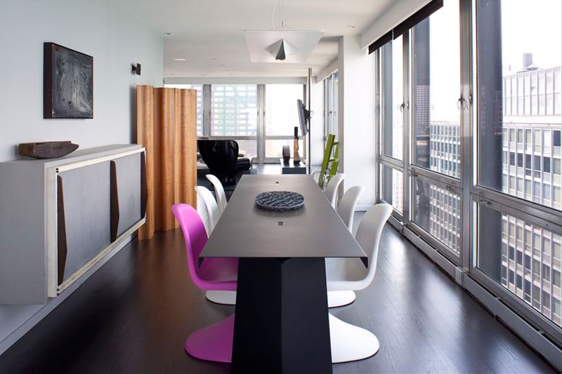 In the interest of having a light, open space which would respond to the changing sky, a color palette was developed using subtle shades of gray that relate to the surrounding glass, steel and stone. Many examples of important design in the client's collection were added with site-specific concerns in mind, including pieces by Andrea Branzi, Ettore Sottsass, Gio Ponti, Erik Levy, Ingo Maurer and Cini Boeri.