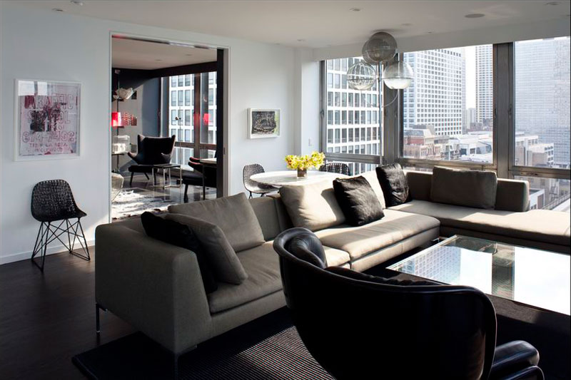 One half of the top floor, in a landmark lakefront high-rise designed by Ludwig Mies van der Rohe, this penthouse apartment was purchased to be a backdrop for the clients' collections of modern art and important vintage design. With walls of glass, the city and water views are dramatic and ever-changing; a vibrant downtown home for new "empty-nesters."